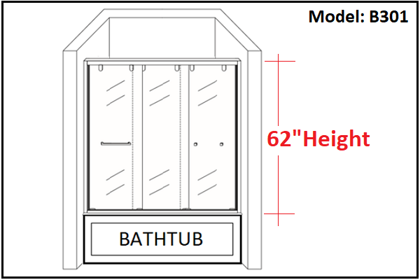 B-301 Frameless 60" x 62" Stainless Steel- 3 Sliding Glass Panels Above Bathtub Shower Door